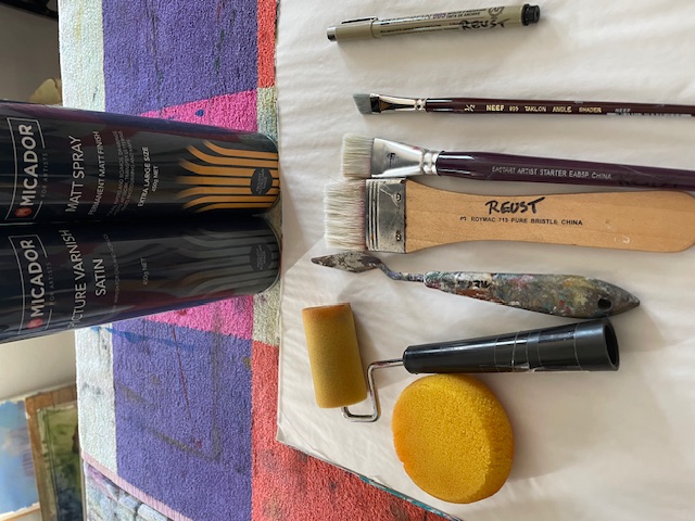 Acrylic paint (not Jo Sonja)for the washes. Some good colour choices include Red Gold, Permanent Alizarin, Phthalo Turquoise, Quinacridone Magenta, Ultramarine Blue, Cerulean Blue, Dioxazine Purple, Paynes Grey. NB if you don’t have acrylics, please feel free to use mine for your washes