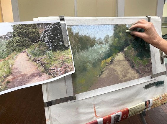 Her demonstration took us from concept to colour, weaving in stories and emotional connections with each reference photo. With a thoughtful palette and signature edge work, Louise transformed feeling into form with her demo piece of a path leading us through to a pink flowering bush. We left energised, reminded to embrace the beauty around us—and to “live ready” in the studio and beyond.